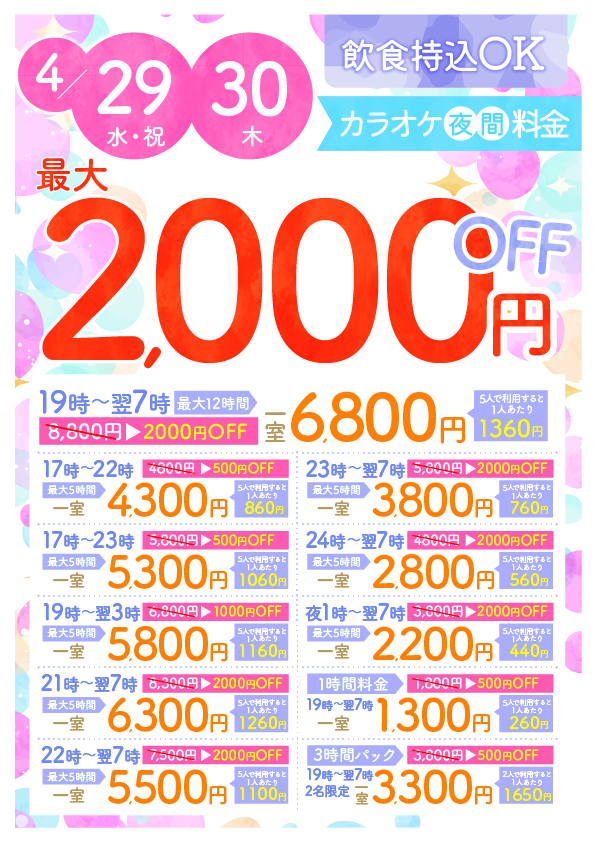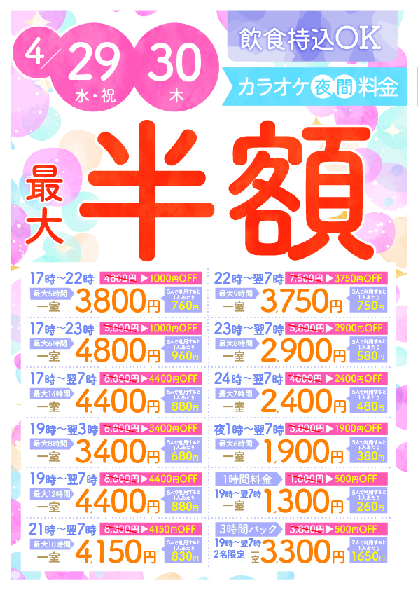【GW】4月29日30日夜カラオケキャンペーン