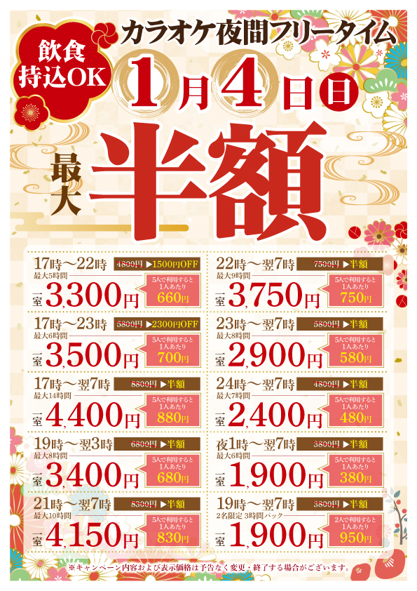 > 【半額割引】1月4日(土)カラオケキャンペーン